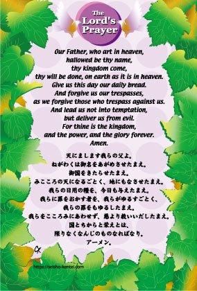 天にまします我らの父よ。ねがわくは御名をあがめさせたまえ。御国をきたらせたまえ。みこころの天になるごとく、地にもなさせたまえ。我らの日用の糧を、今日も与えたまえ。我らに罪をおかす者を、我らがゆるすごとく、我らの罪をもゆるしたまえ。我らをこころみにあわせず、悪より救いいだしたまえ。国とちからと榮とは、限りなくなんじのものなればなり。アーメン。